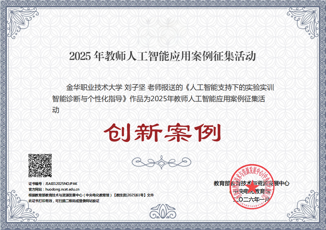 近日,教育部教育技术与资源发展中心公布了2025年度人工智能赋能教育应用案例评选结果,金华职业技术大学信息工程学院刘子坚副教授报送的《人工智能支持下的实验实训智能诊断与个性化指导》案例成功入选,标志着学校在“人工智能+职业教育”领域取得重要突破。