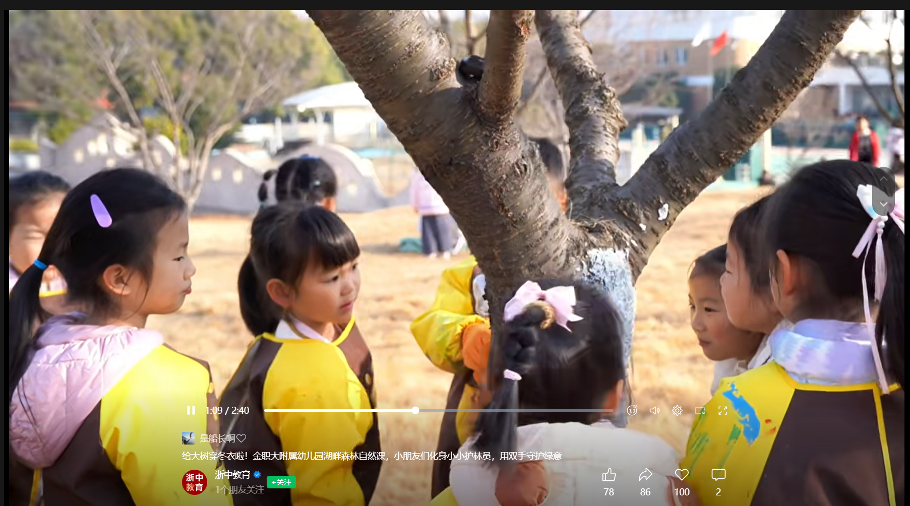 浙中教育视频号:给大树穿冬衣啦!金职大附属幼儿园湖畔森林自然课,小朋友们化身小小护林员,用双手守护绿意