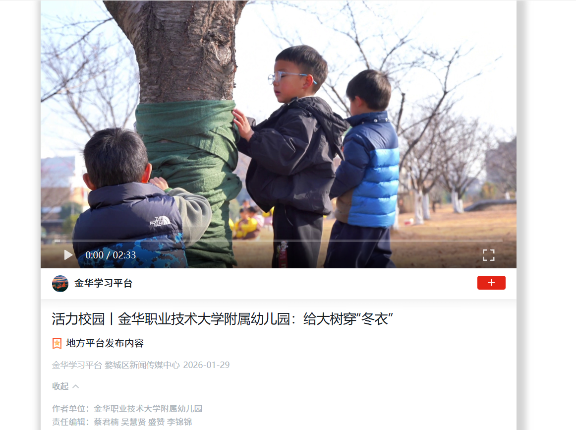 学习强国 金华学习平台:活力校园丨金华职业技术大学附属幼儿园:给大树穿“冬衣”