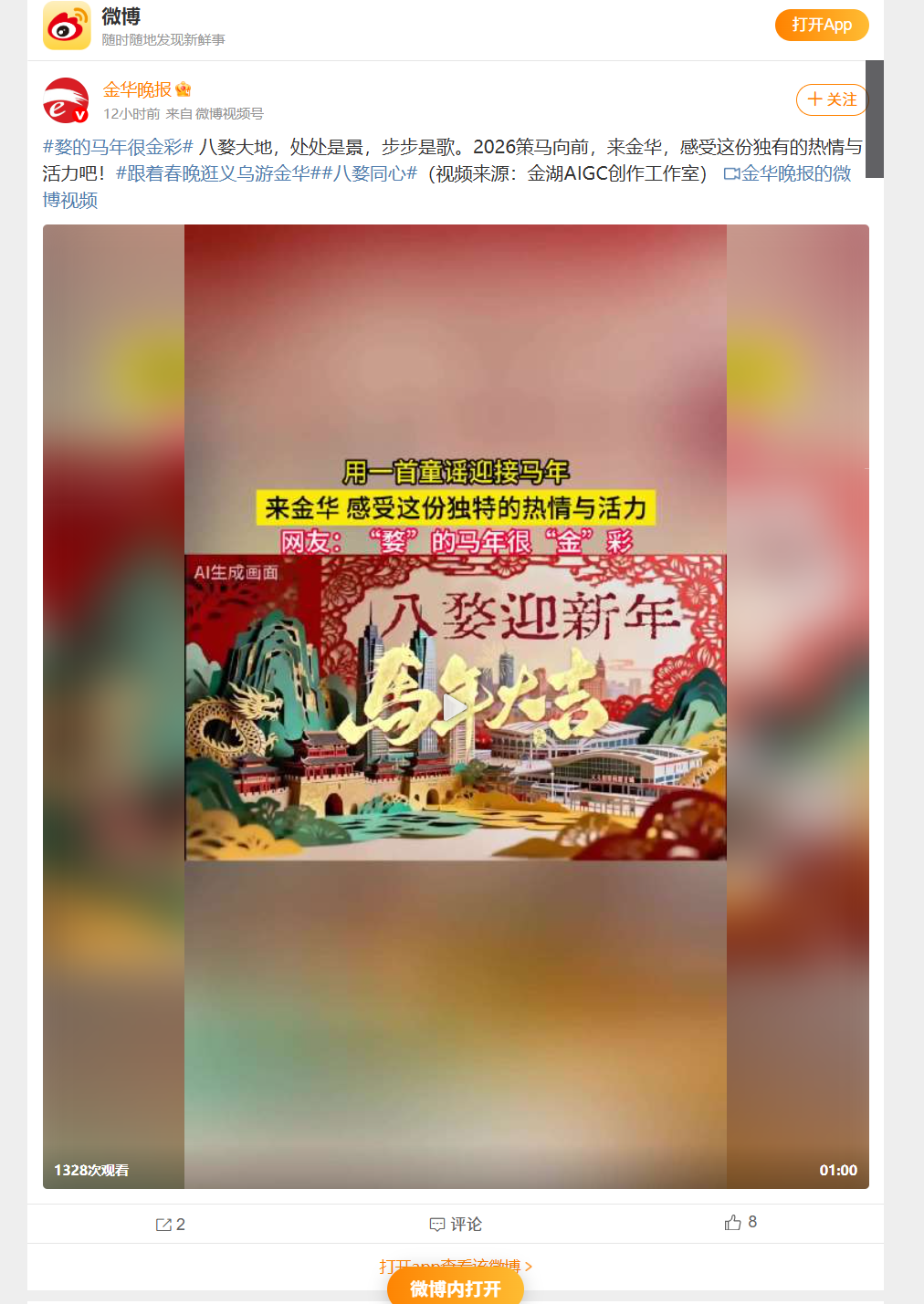 微博:#婺的马年很金彩# 八婺大地,处处是景,步步是歌。2026策马向前,来金华,感受这份独有的热情与活力吧!#跟着春晚逛义乌游金华##八婺同心#(视频来源:金湖AIGC创作工作室) 金华晚报的微博视频
