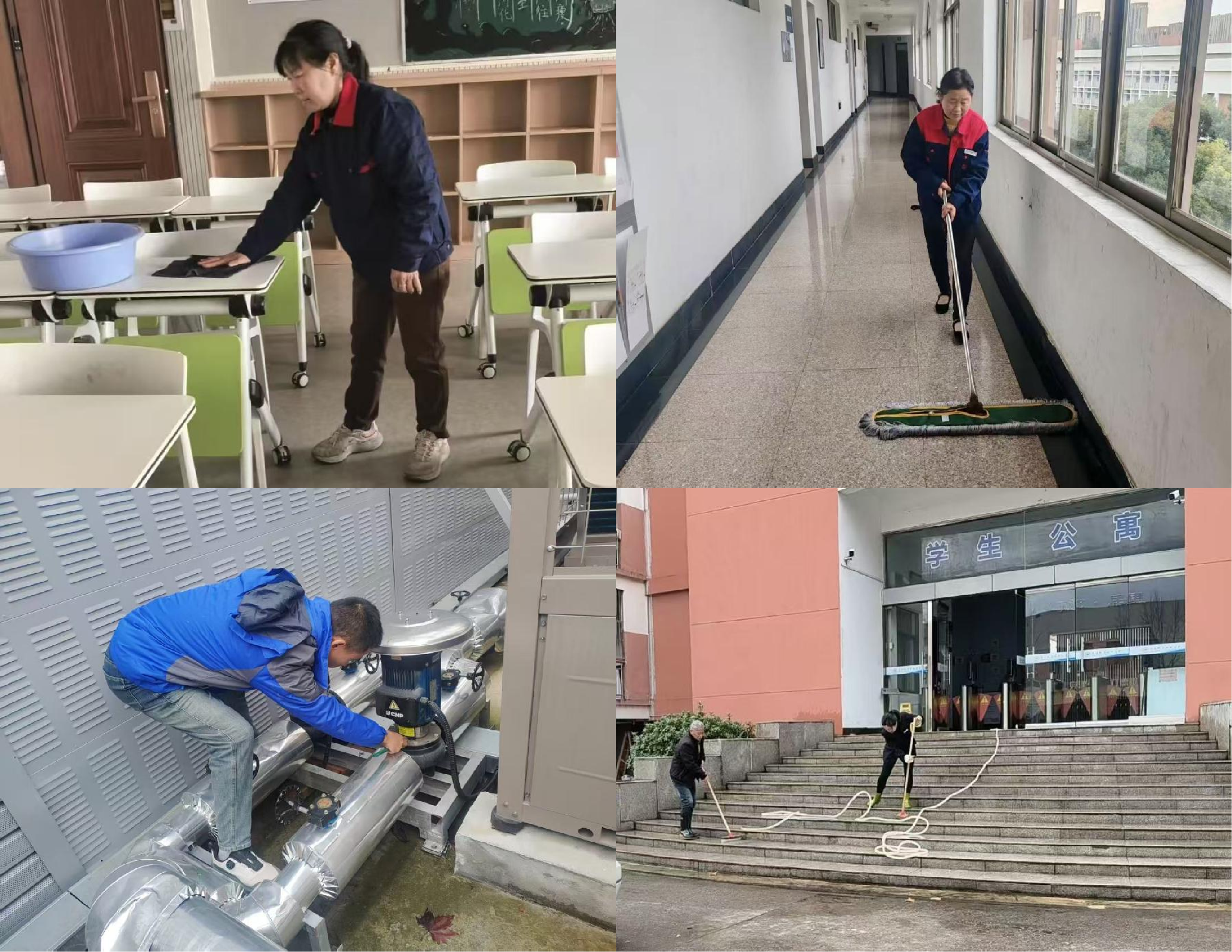 在学生公寓与教学楼区域,工作人员对公共区域实施了深度清洁,涵盖地面清扫、墙面除尘以及门窗擦拭等工作,并着重对楼梯扶手、卫生间等高频接触区域进行了消杀处理。与此同时,第三方服务团队对空调、洗衣机、直饮水机和热水系统展开了全面检修,更换滤芯并调试水温,以确保设备运行的安全性与稳定性。校园道路清扫工作也同步推进,落叶清运、死角清理、路灯报修等细节工作均落实到位,从而保障师生的出行安全。