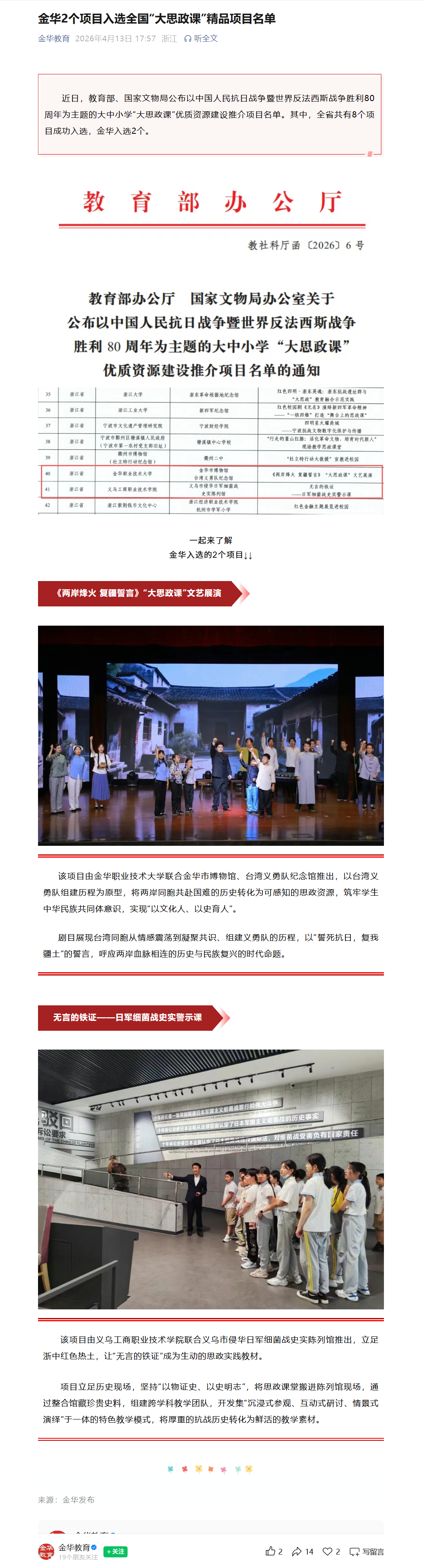 金华教育:金华2个项目入选全国“大思政课”精品项目名单