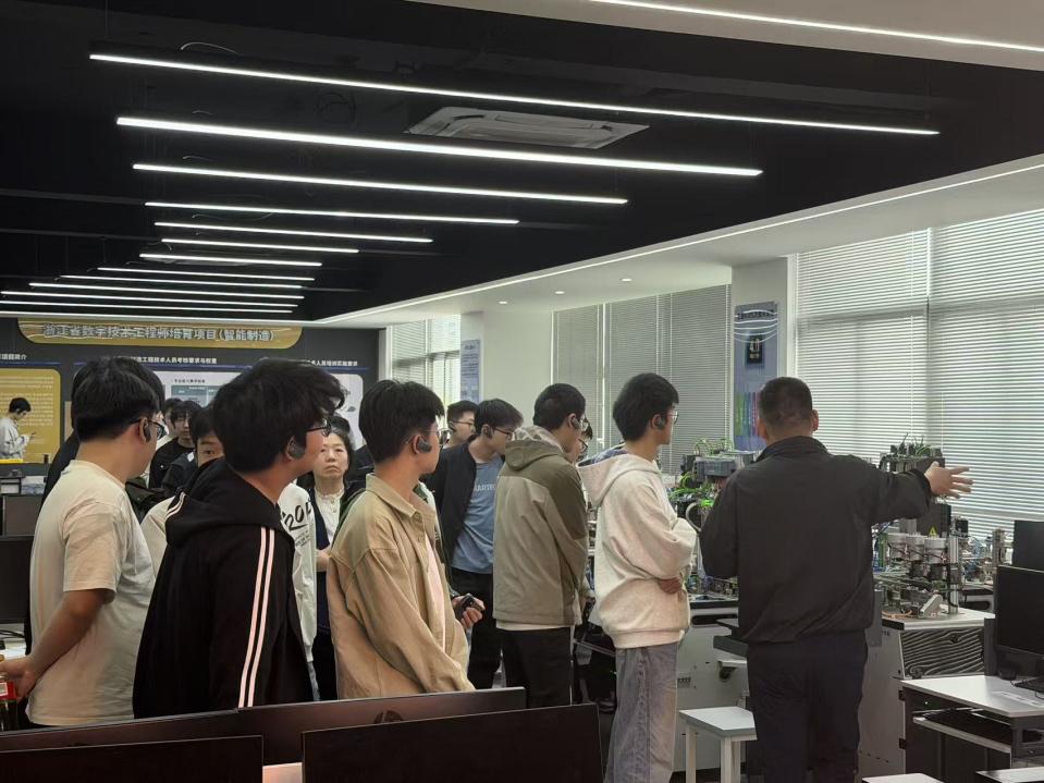 活动首站,同学们走进萧山技师学院实训基地,开展实地研学。在专业教师引导下,学生们参观了多轴加工实训基地、机器人实训基地、工业4.0实训基地,并近距离观摩了第48届世界技能大赛CAD机械设计项目及工业设计技术项目中国集训基地。高精尖的设备、备赛选手精益求精的操作,让同学们直观感受到了现代技工教育的硬核实力与工匠精神的深刻内涵,进一步明晰了专业技能提升的方向。