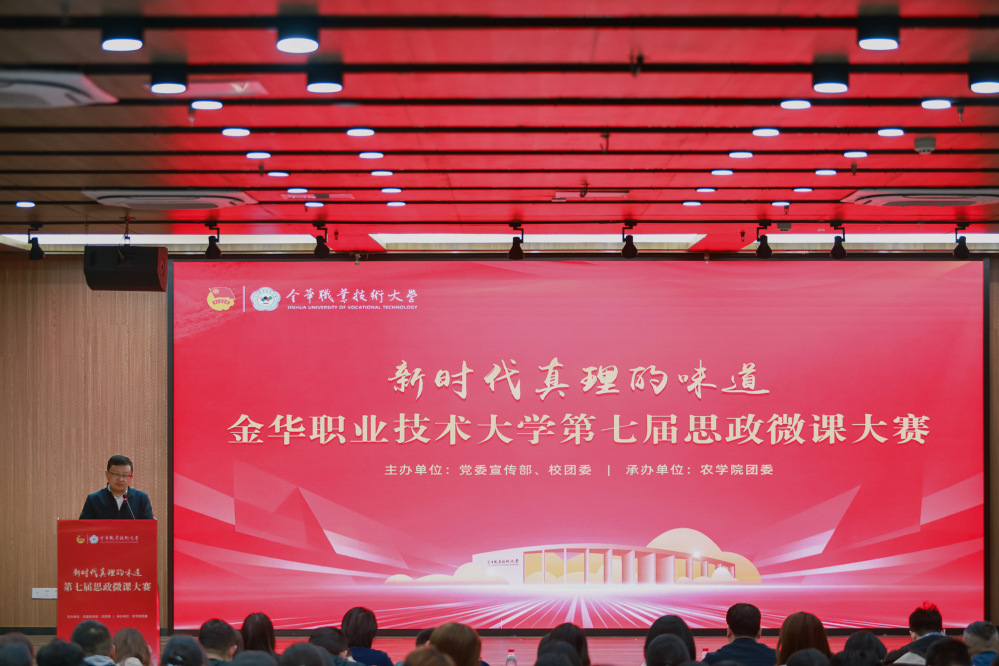 校党委副书记劳虓虓发表致辞。他指出,本次思政微课大赛是学校深入贯彻党的二十大和二十届历次全会精神、立足“十五五”规划开局之年新起点、紧扣青年发展型省份建设目标、推进大中小学思想政治教育一体化的重要举措。他希望广大青年师生要深挖金华本土红色资源,紧扣中心大局,用青年视角阐释党的创新理论、传递新时代好声音;也希望师生紧扣中心大局,既讲透“八八战略”在浙江的生动实践,也展现金华高质量发展的鲜活场景;更希望广大青年以赛为媒、以讲促学,用青年视角阐释党的创新理论,用青年语言传播新时代好声音,自觉把真理力量转化为实干行动,在服务浙江“两个先行”、助力金华现代化建设的征程中,奋力书写挺膺担当的青春篇章。