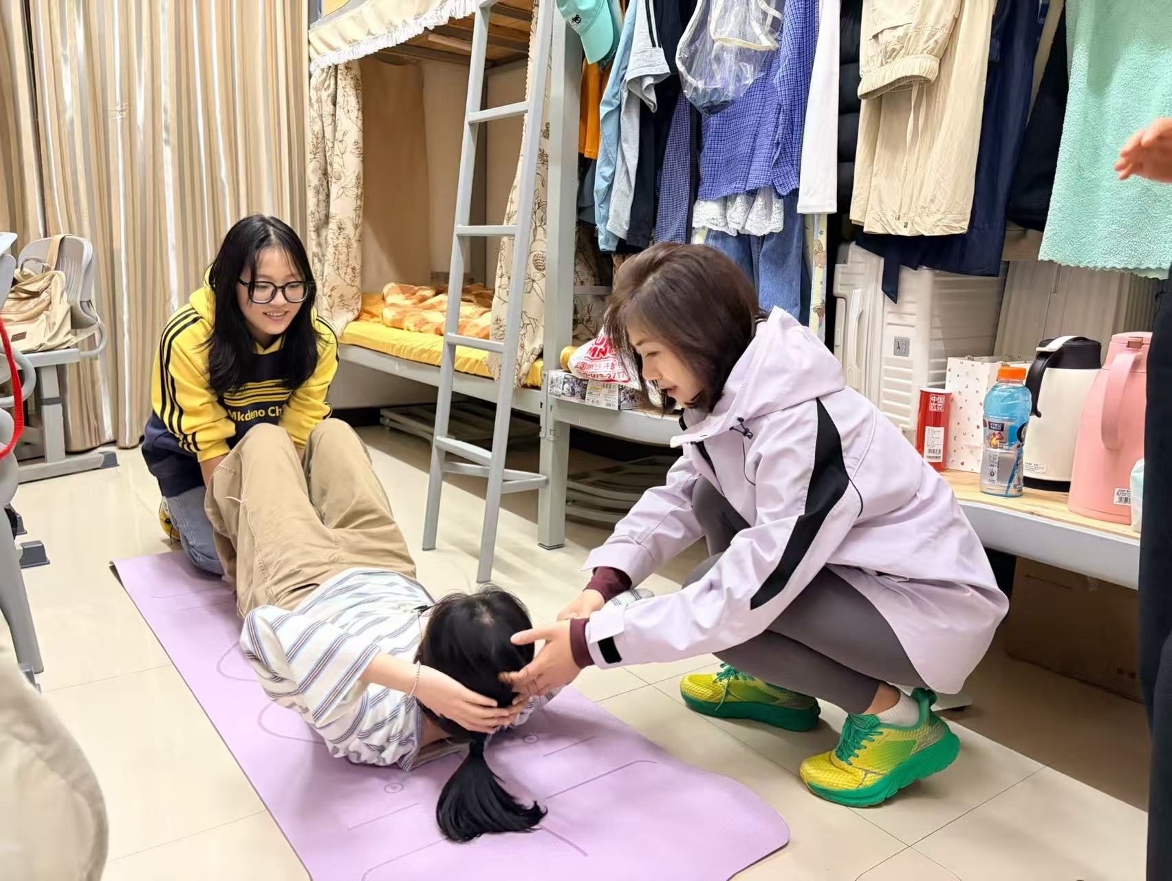 体测准备不止于训练场,为掌握学生训练状态,学院常态化开展晚间寝室走访,与学生亲切交流,对于训练受伤的学生,细致询问伤情、提供帮扶,用关怀传递温暖。