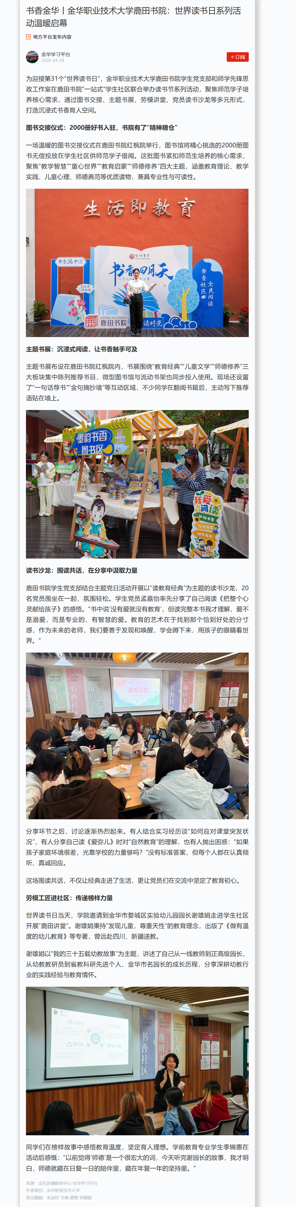 学习强国 金华学习平台:书香金华丨金华职业技术大学鹿田书院:世界读书日系列活动温暖启幕