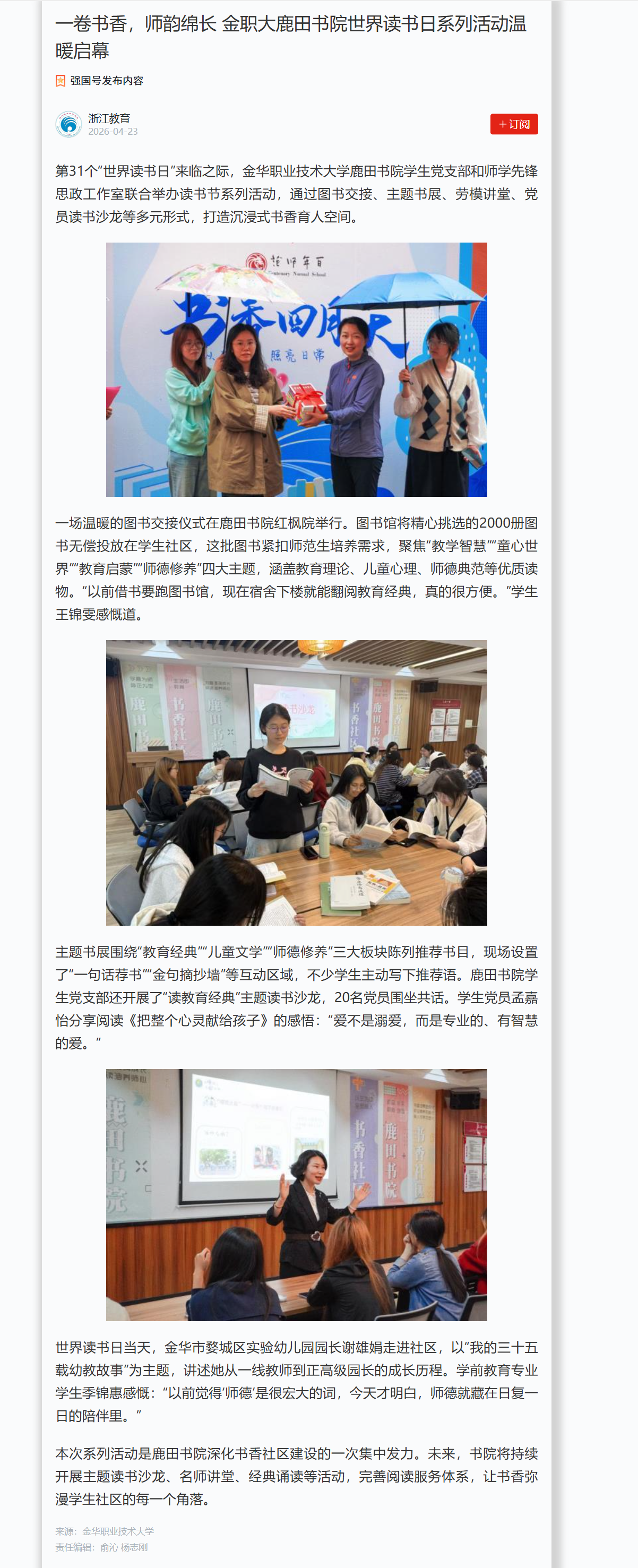 学习强国 浙江教育:一卷书香,师韵绵长 金职大鹿田书院世界读书日系列活动温暖启幕