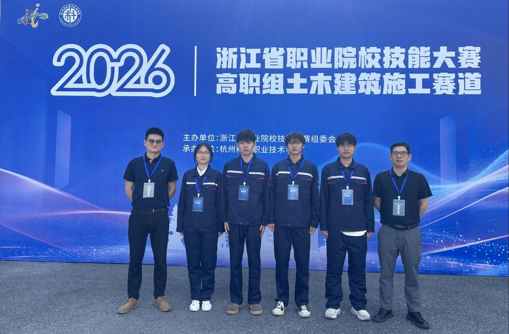 4月25日至26日,2026年浙江省职业院校技能大赛高职组土木建筑施工赛道在杭州科技职业技术学院圆满落幕。本次大赛汇聚全省高职院校57支精英队伍同台比拼,赛事竞争激烈。由建筑工程学院唐晶、罗东平两位老师指导,杨霆宇、朱滇、郭孝天、朱思嘉四名学生组成的代表队凭借扎实的专业技能、突出的创新能力和优秀的团队协作表现脱颖而出,一举斩获该赛道金奖!