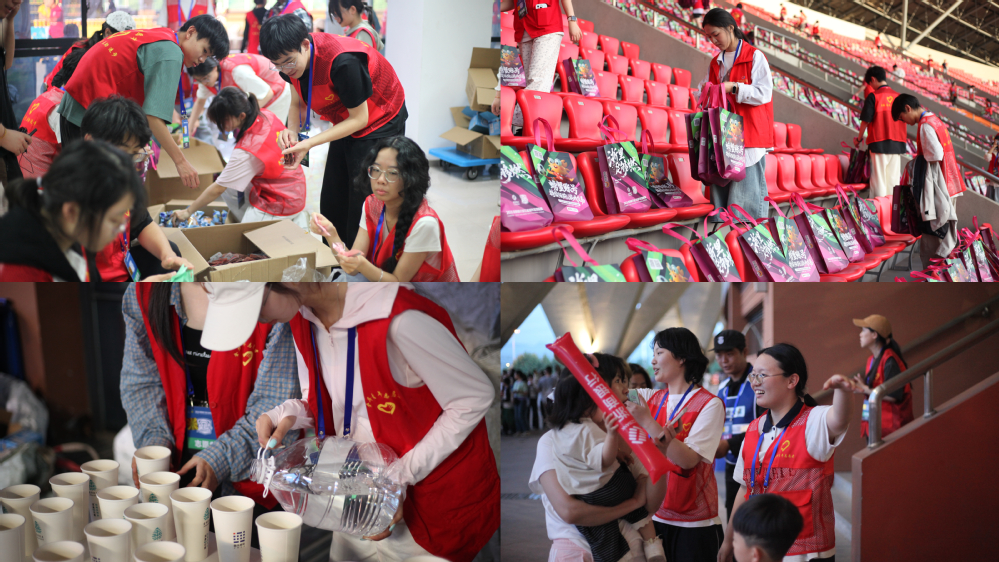 赛事进行中,身着统一服装的志愿者坚守岗位、全程待命。入口处,他们以微笑引导观众有序入场,耐心解答路线指引、座位分布、场区功能等各类咨询;观赛中,志愿者文明提醒观赛礼仪,及时疏导现场人流、巡查赛场环境、协助处置突发状况,全力维护赛场秩序;饮水保障点位上,志者快速补给物资、主动提供贴心帮扶,保障赛事各环节衔接顺畅、运行高效。志愿者们穿梭于赛场各个角落,用暖心服务回应观众需求,用实际行动践行责任担当,一抹抹鲜亮的“志愿红”成为绿茵场外最动人的风景,充分展现了金职青年的良好精神风貌。
