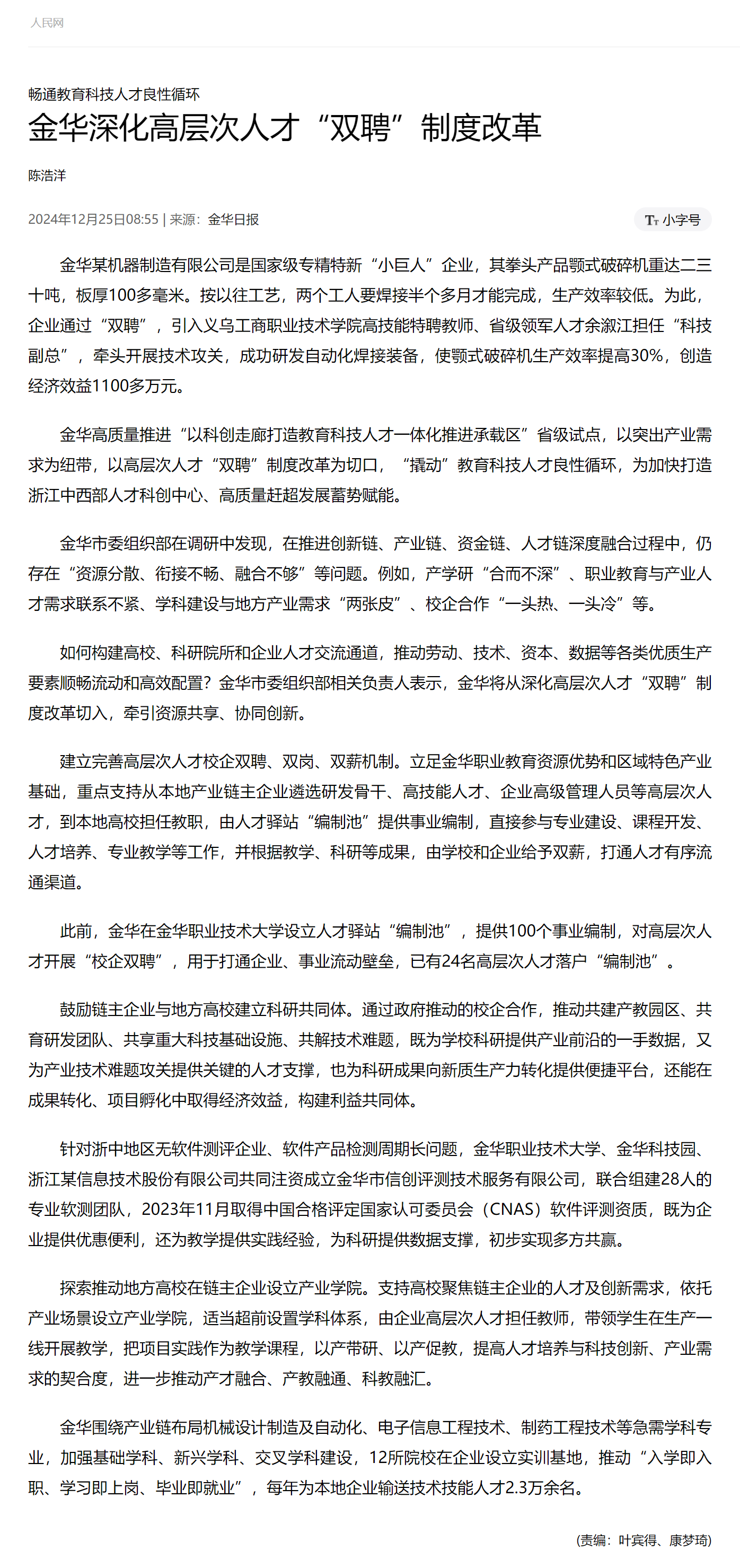人民网:畅通教育科技人才良性循环 金华深化高层次人才“双聘”制度改革