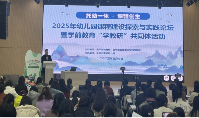 3月7日,由金华市教育局和金华职业技术大学师范学院联合主办的幼儿园课程建设探索与实践论坛暨区域学前教育“学教研”共同体主题活动在金华市实验幼儿园举行。金华市教育局基础教育处、教育教学研究中心、金职大师范学院相关领导,市各县市(区)教研员、幼教干部、园长、骨干教师以及金职大学前教育专业、早教专业、婴幼儿托育与管理专业的教师170余人参加了活动。