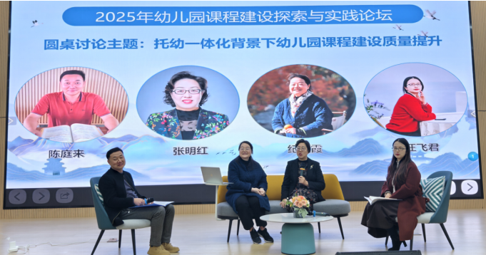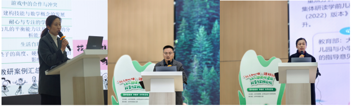 金东区实验幼儿园园长黄丽娜从一场变革出发,深入浅出地分享了如何发现与支持幼儿有意义的学习;金华职业技术大学附属幼儿园园长许兴建从幼儿对大自然的需求出发,分享了基于在地资源共享的湖畔森林自然体验课程建构路径;金华市实验幼儿园副园长陶涛从幼儿现状出发,从“询证-审议-思察-支持”四步骤分享了如何助力入学准备阶段儿童的学习与发展。随后,与会专家们对3个分享进行了点评,并围绕“什么是有意义学习”“如何培养托班师资团队”等进行了圆桌讨论,提出了运用量化评价赋能课程质量提升等有效策略。