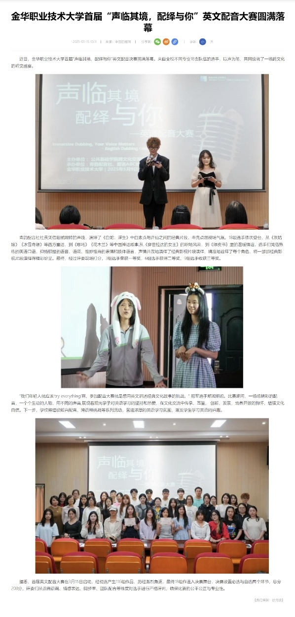 中国日报网:金华职业技术大学首届“声临其境,配绎与你”英文配音大赛圆满落幕