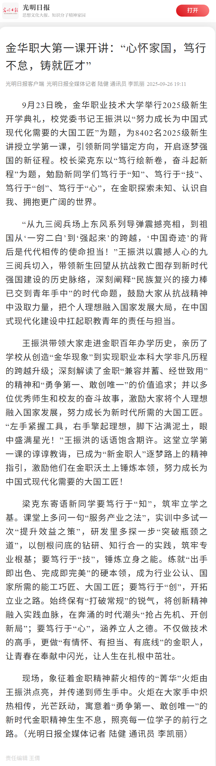 光明日报客户端:金华职大第一课开讲:“心怀家国,笃行不怠,铸就匠才”