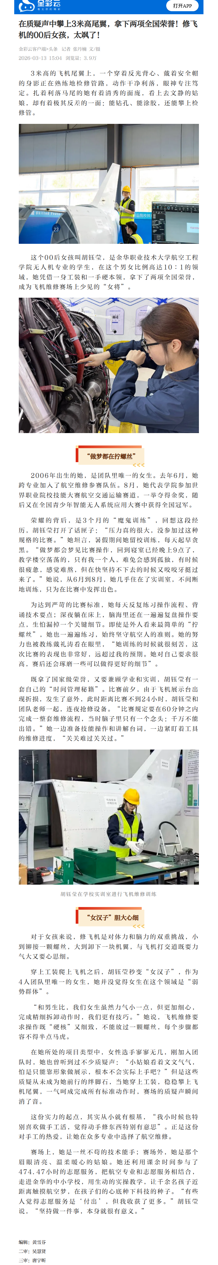 金彩云客户端:在质疑声中攀上3米高尾翼,拿下两项全国荣誉!修飞机的00后女孩,太飒了!