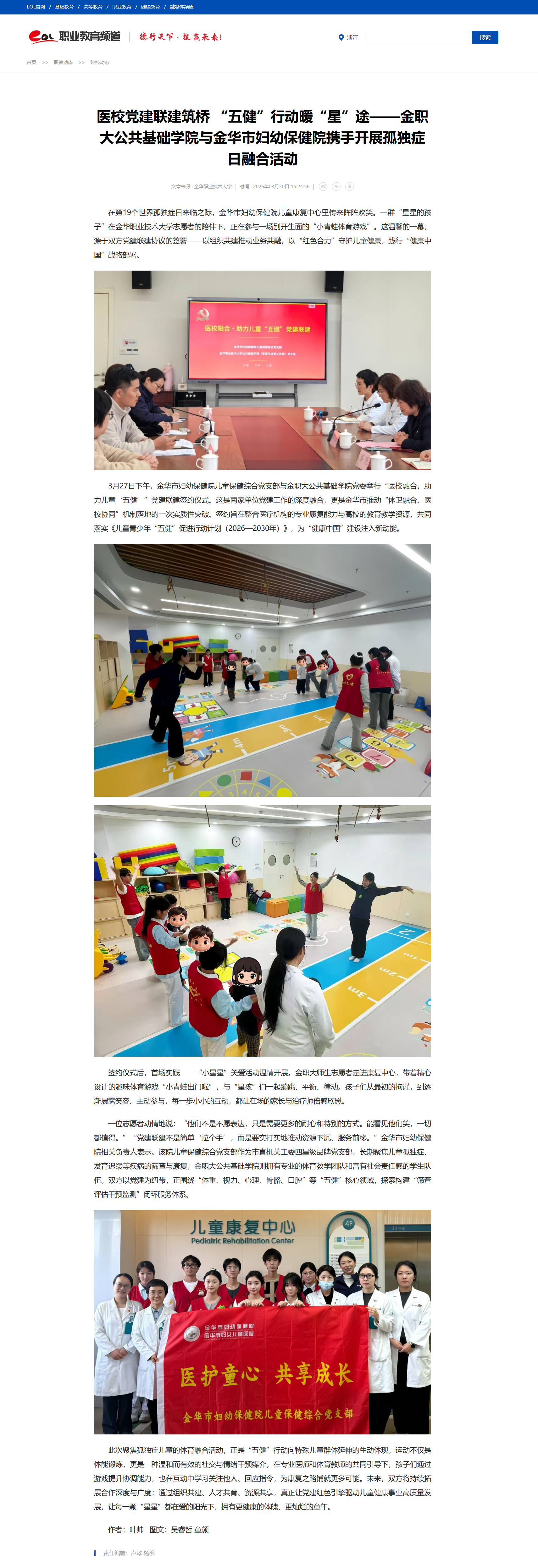 中国教育在线:医校党建联建筑桥 “五健”行动暖“星”途——金职大公共基础学院与金华市妇幼保健院携手开展孤独症日融合活动