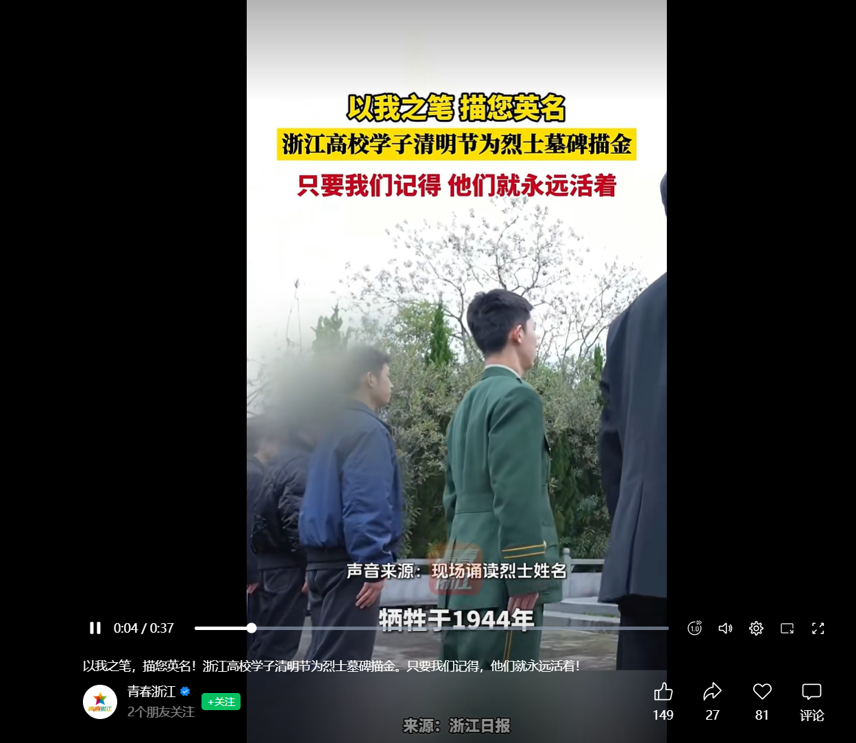 青春浙江视频号:以我之笔,描您英名!浙江高校学子清明节为烈士墓碑描金。只要我们记得,他们就永远活着!