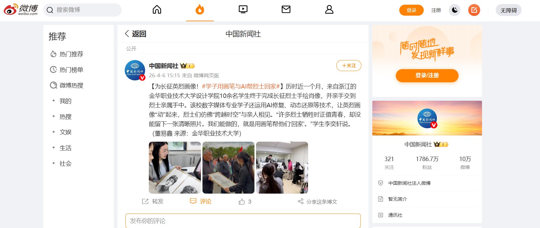 中国新闻社微博:【为长征英烈画像!#学子用画笔与AI帮烈士回家#】
