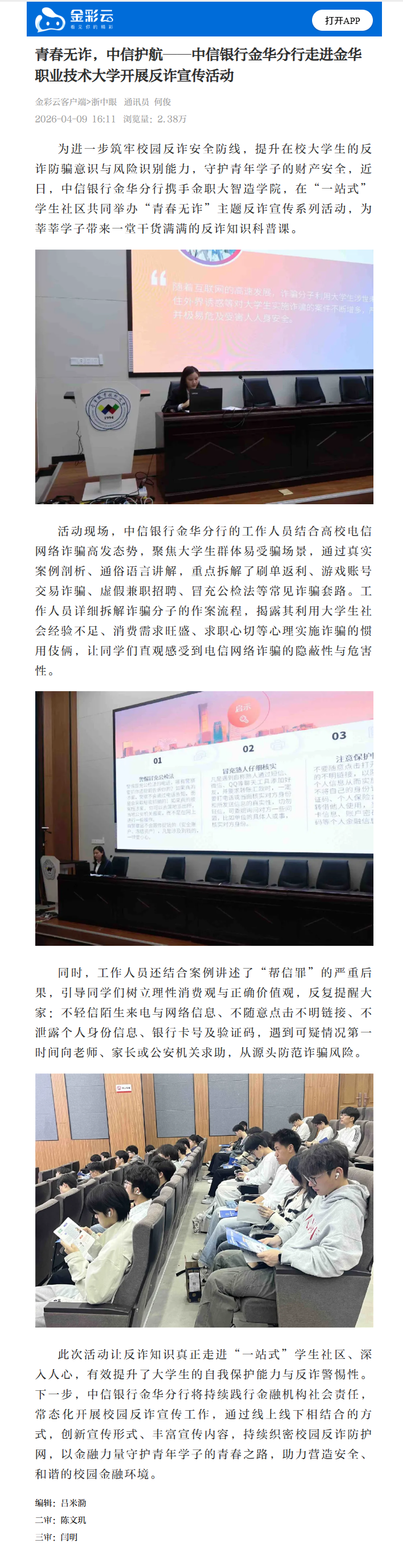 金彩云客户端:青春无诈,中信护航——中信银行金华分行走进金华职业技术大学开展反诈宣传活动