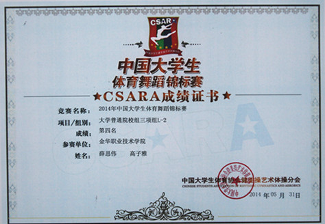 薛思维、高子雅同学(师范学院)荣获2014年中国大学生体育舞蹈竞标赛大学普通院校组三项组L-2 第...