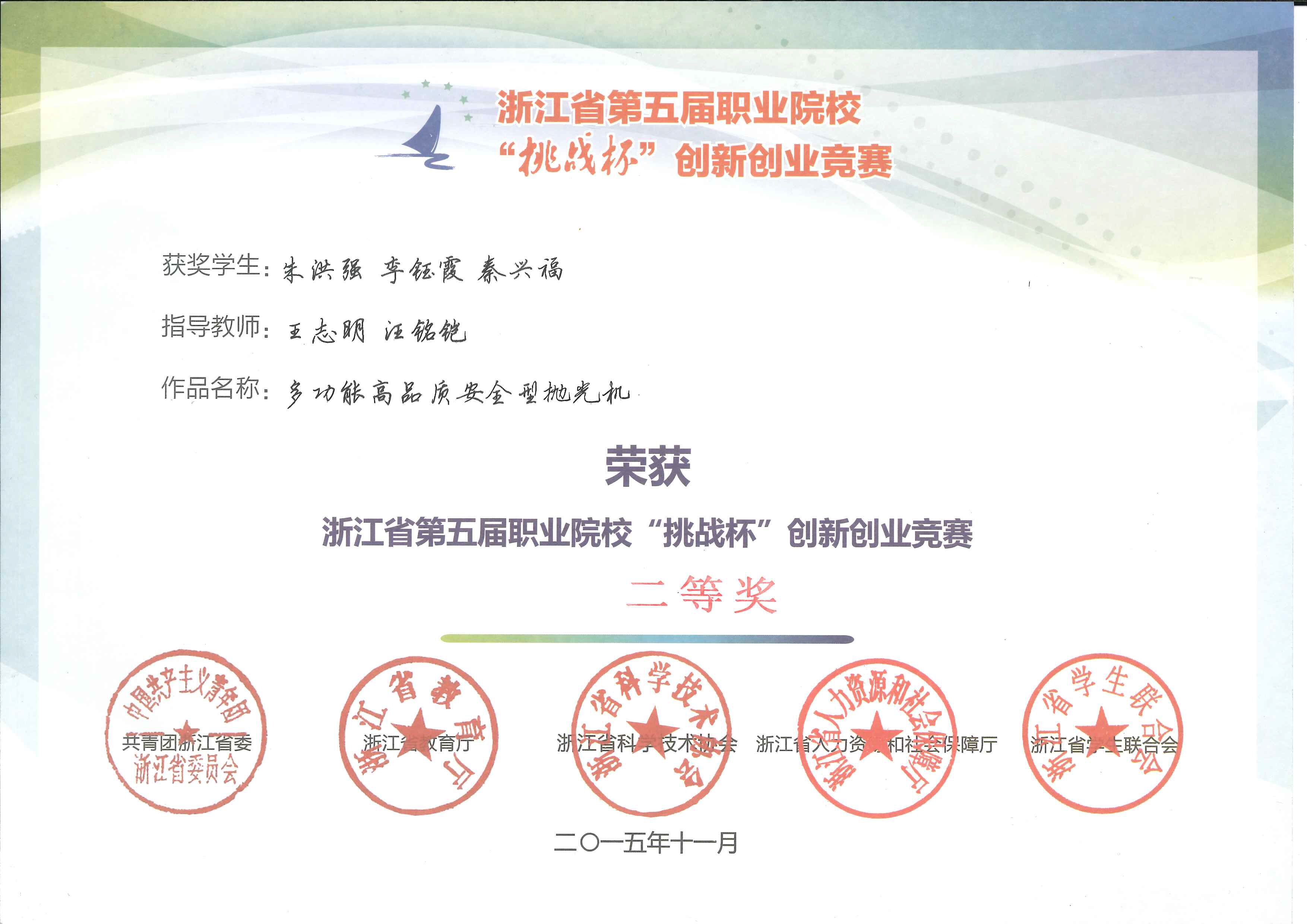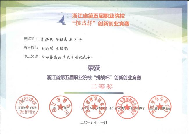朱洪强 李钰霞 秦兴福同学(机电工程学院)荣获浙江省第五届职业院校“挑战杯”创新创业竞赛二等...